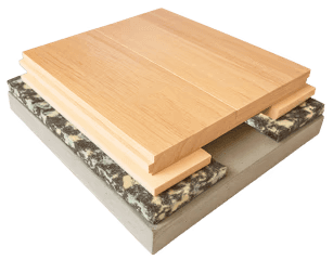Sistema multicapa con barrera anti-vapor 0.15 mm, pads amortiguadores 10 mm, bastidor flotante y duela 22 mm x 130 mm x 1830 mm Prelijado, barniz 6 capas y demarcación y logo poliuretano. Instalación especializada in situ.